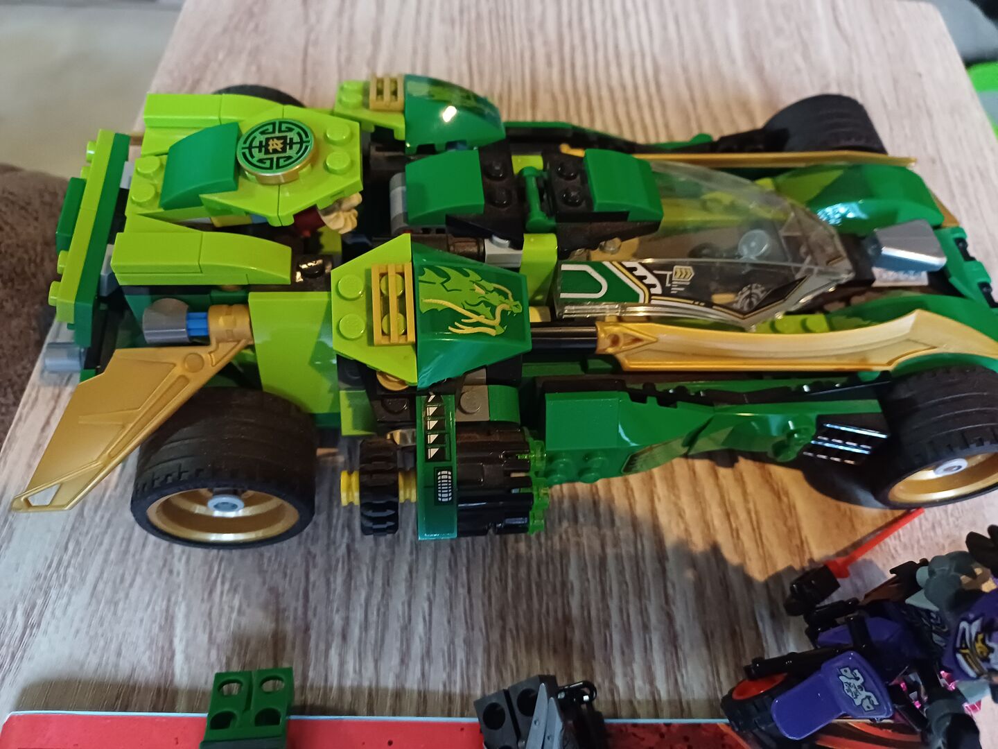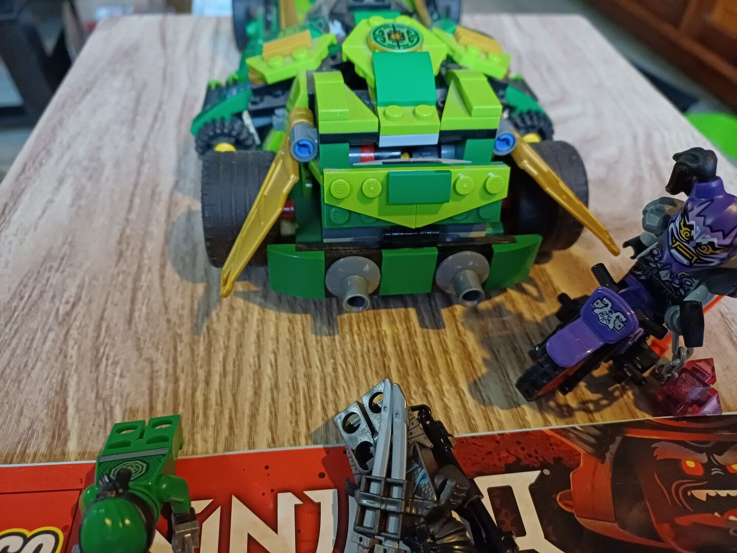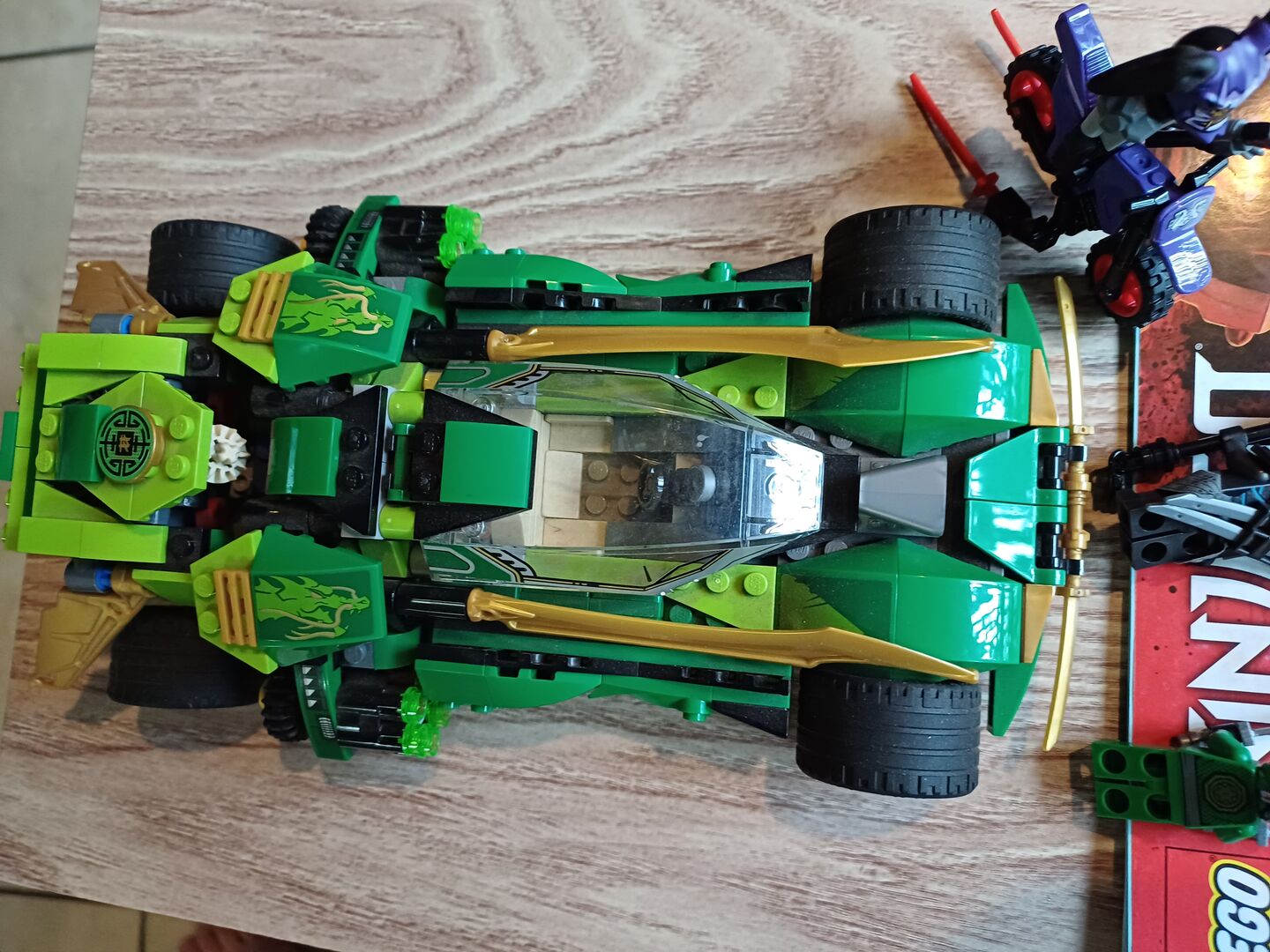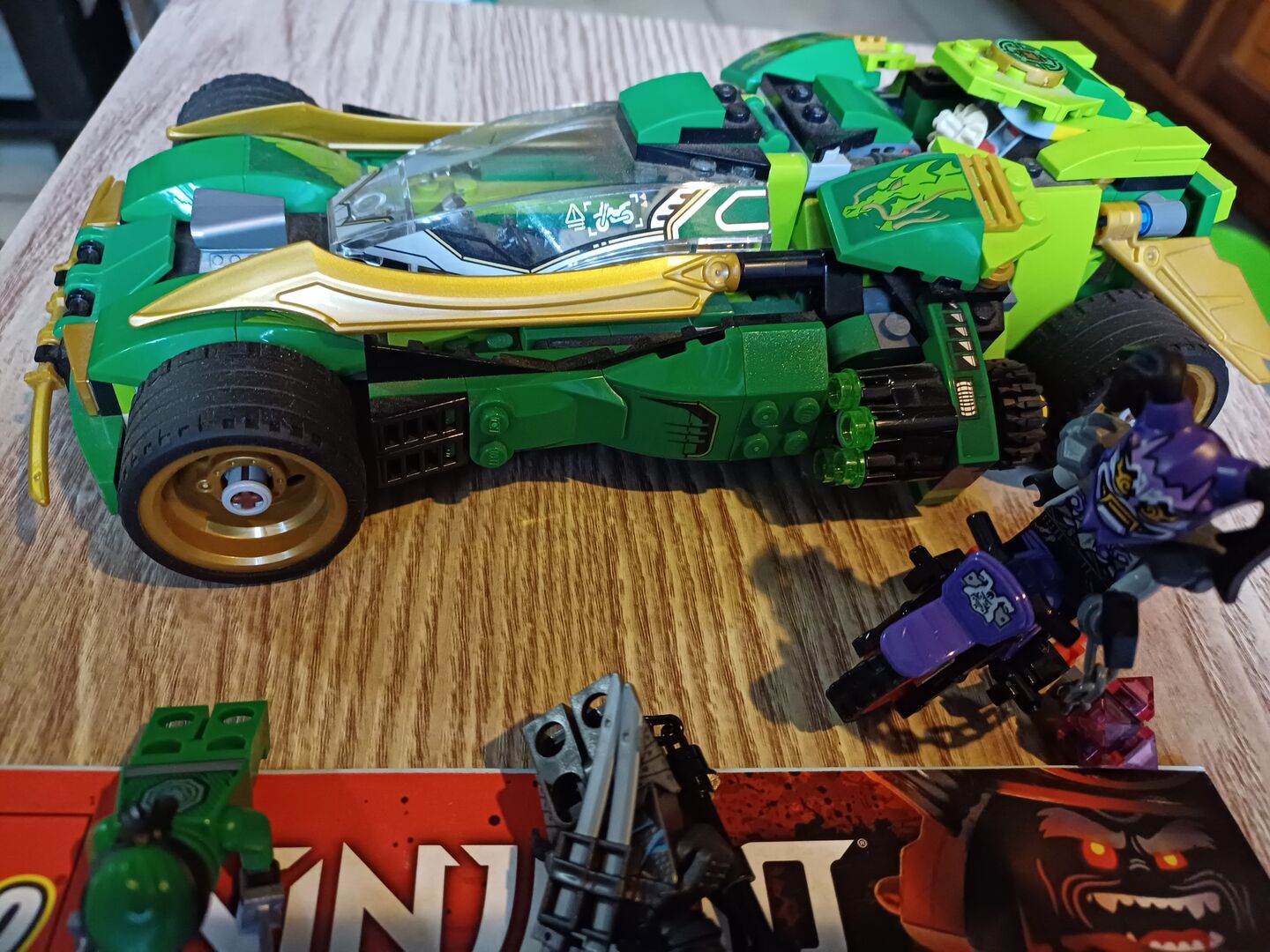 LARGE LEGO Ninjago Ninja Night Crawler (70641) - Set is 100% complete. Includes 100% pieces, minifigures and instruction manual. 552 pieces. Includes 3 minifigures: Lloyd, Nya and Ultra Violet. Features an opening minifigure cockpit with weapon holders for 2 swords, speed and attack mode configurations, 2 foldout, shoot-on-the-go, 6-stud rapid shooters and gold-colored blades. Press down for attack mode and drive to activate the new-for-January-2018 shoot-on-the-go rapid shooter function. Also includes the Stone Booster Bike with a minifigure seat. Weapons include Lloyd’s 2 katanas, Nya’s spear and 2 katanas, and Ultra Violet’s mace