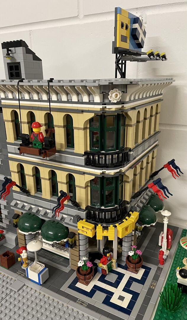 Organize a glittering premiere party at the Grand Cinema Palace. It's premiere night at the big movie palace. The spotlights illuminate the evening sky as the star drives up in a chic black limousine. Gather the cheering fans on the star-studded sidewalk and admire the detailed foyer with snack bar and ticket sales. Take the majestic staircase to the movie theater with its huge screen, movie projector and fold-out theater seats for 6 minifigures. The LEGO "Modular Building" series has been expanded with an exciting set: the extremely detailed, 2-storey cinema palace. Designed as a corner building, this collectible model features a star-paved walkway, large LEGO-style entrance doors, movie posters, a façade with lettering, a tower with spires and a decorated roof. Includes 6 minifigures: child actress, chauffeur, female guest, male guest, photographer and cinema staff. Set available as shown. Currently still available in stores for over CHF 600.00. This house is almost NEW and belongs to a whole town. All houses are for sale.
